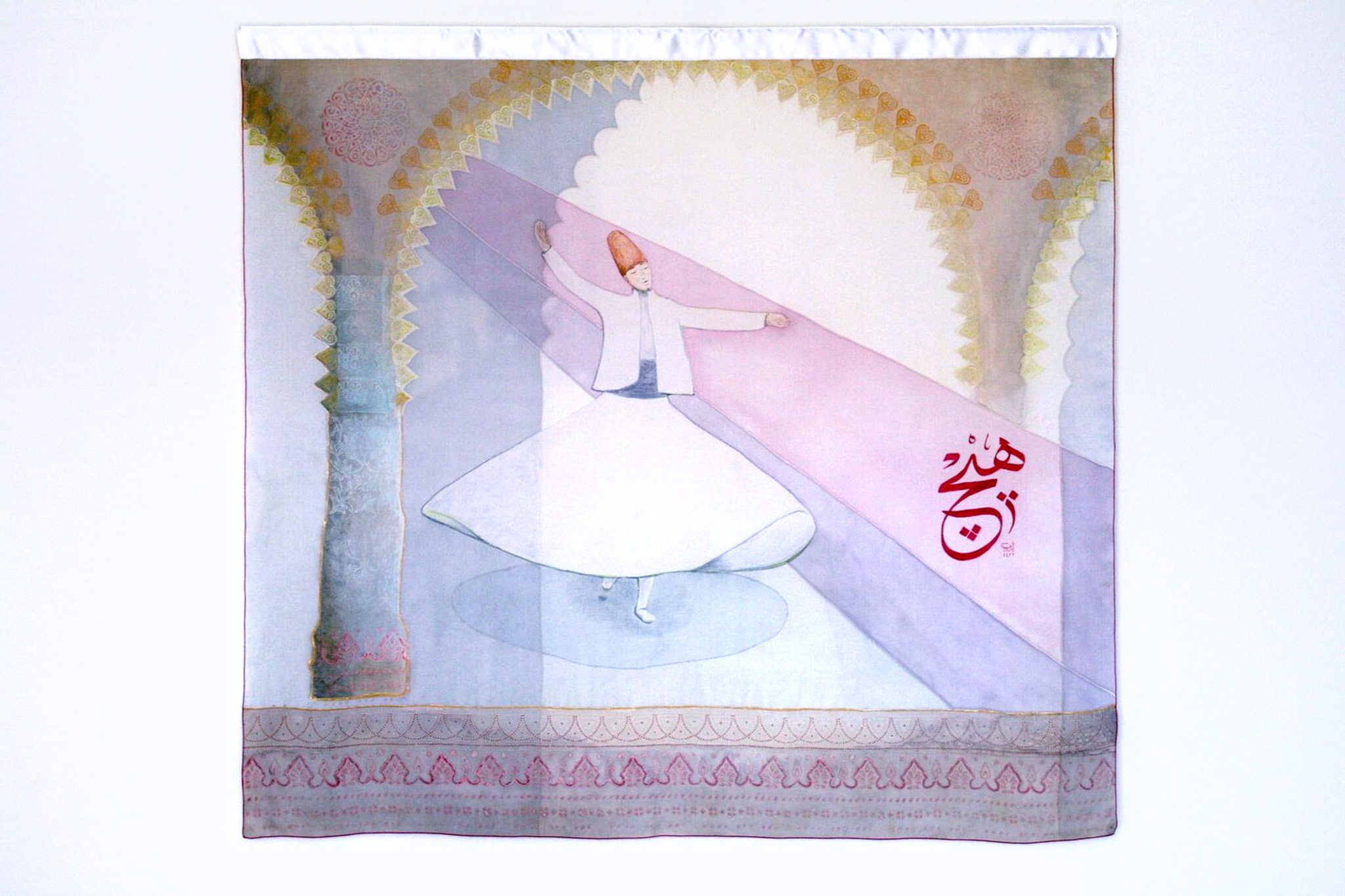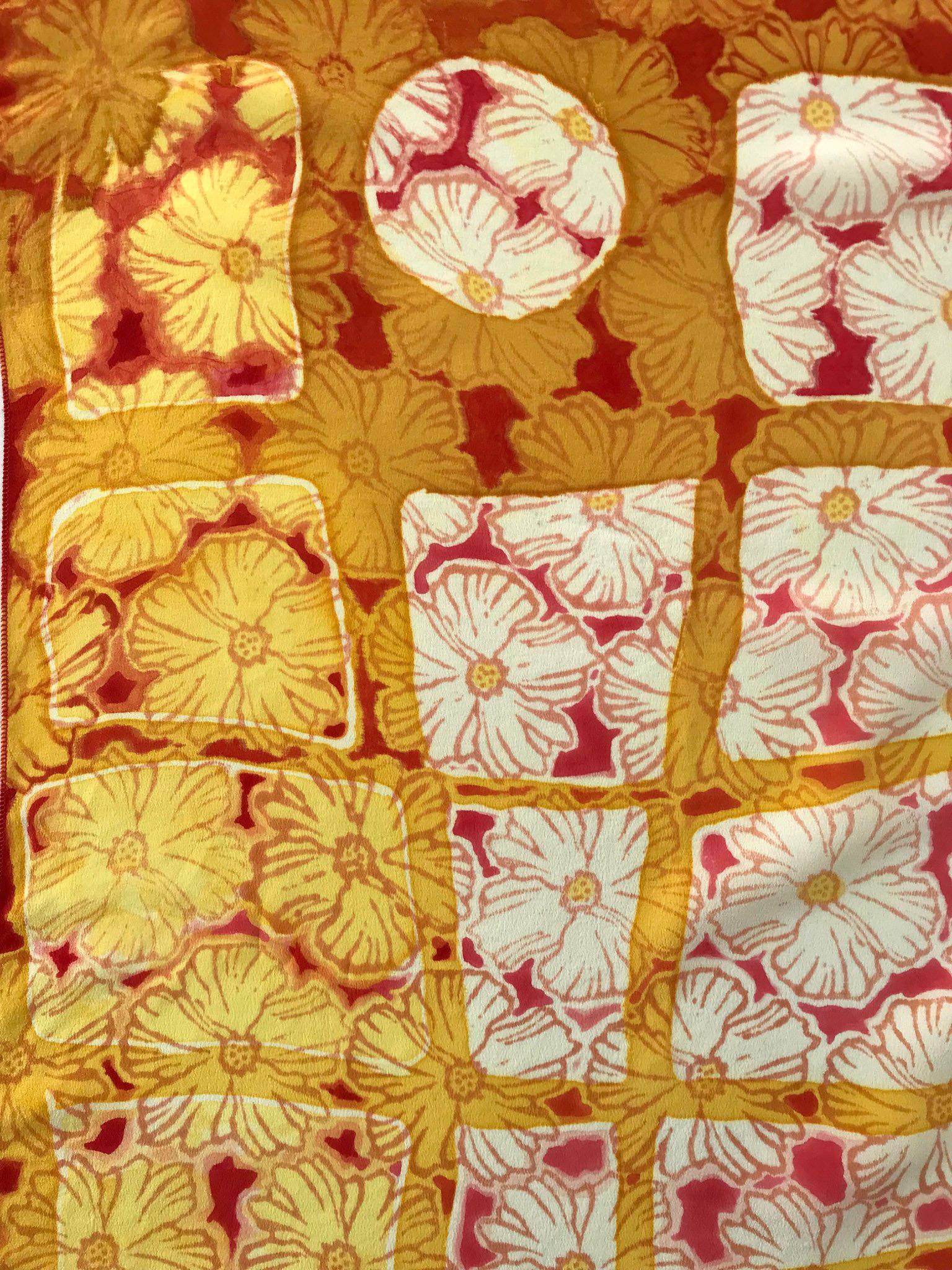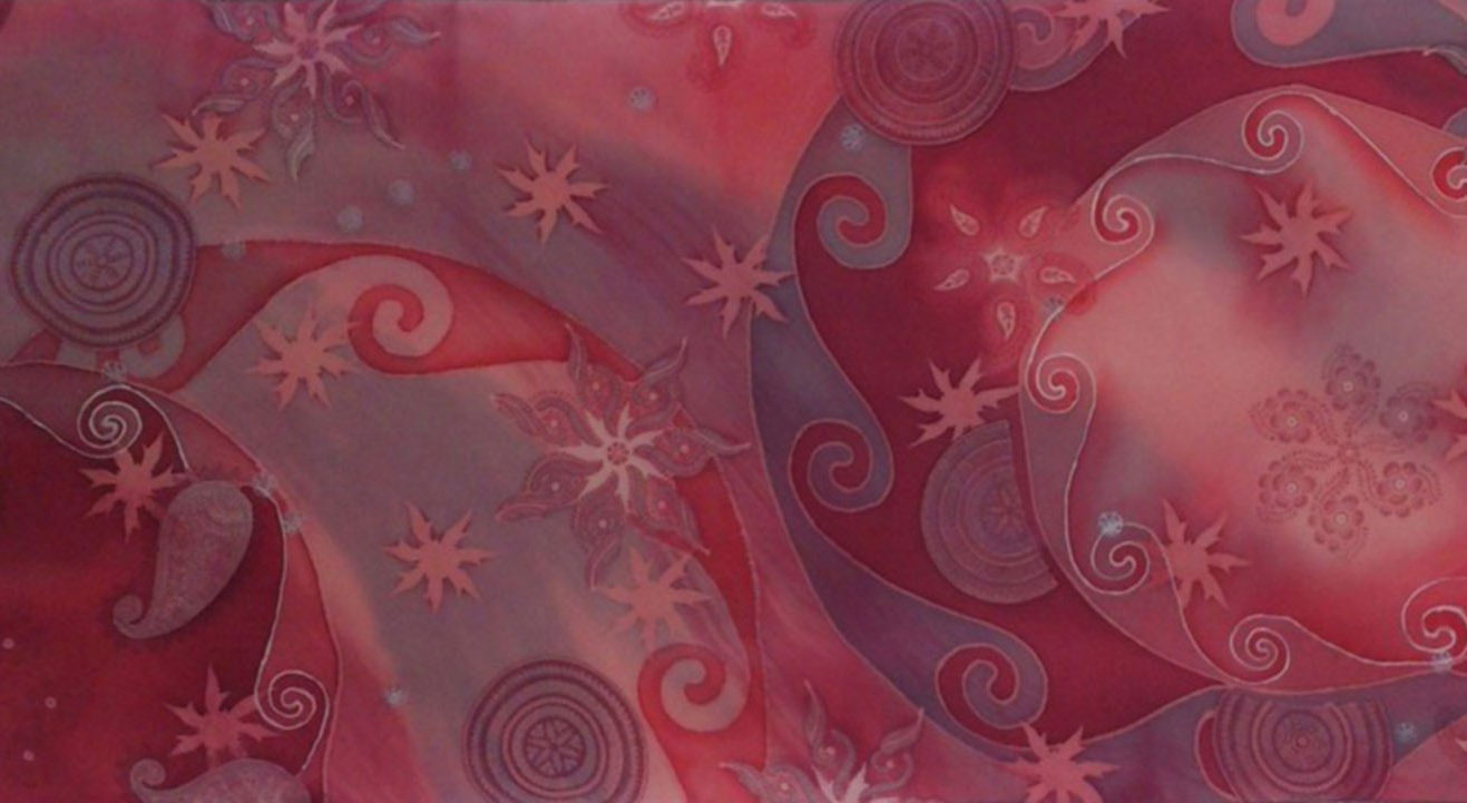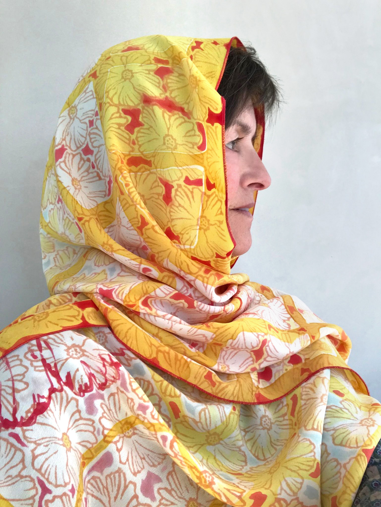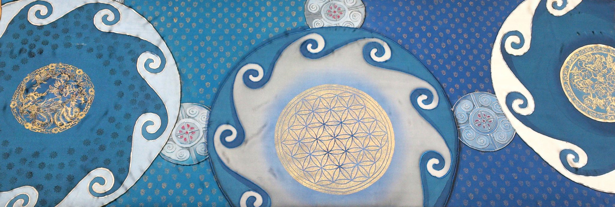 In the process of creating, I use adapted techniques from glass painting and work in many layers, which are fixed through steam. I use old Indian and European textile-printing blocks, often reminiscent of sacred symbols, combined with methods of body impression that I have developed over time.In meiner Arbeit mit den Seidenwerken lasse ich mich auf einen Prozess ein, lasse unser Gespräch nachwirken und folge der Intuition. Ich adaptiere Techniken aus der Glasmalerei, der Seidenmalerei und dem Stoffdruck und nutze alte indische und europäische Stoffdruckstempel.