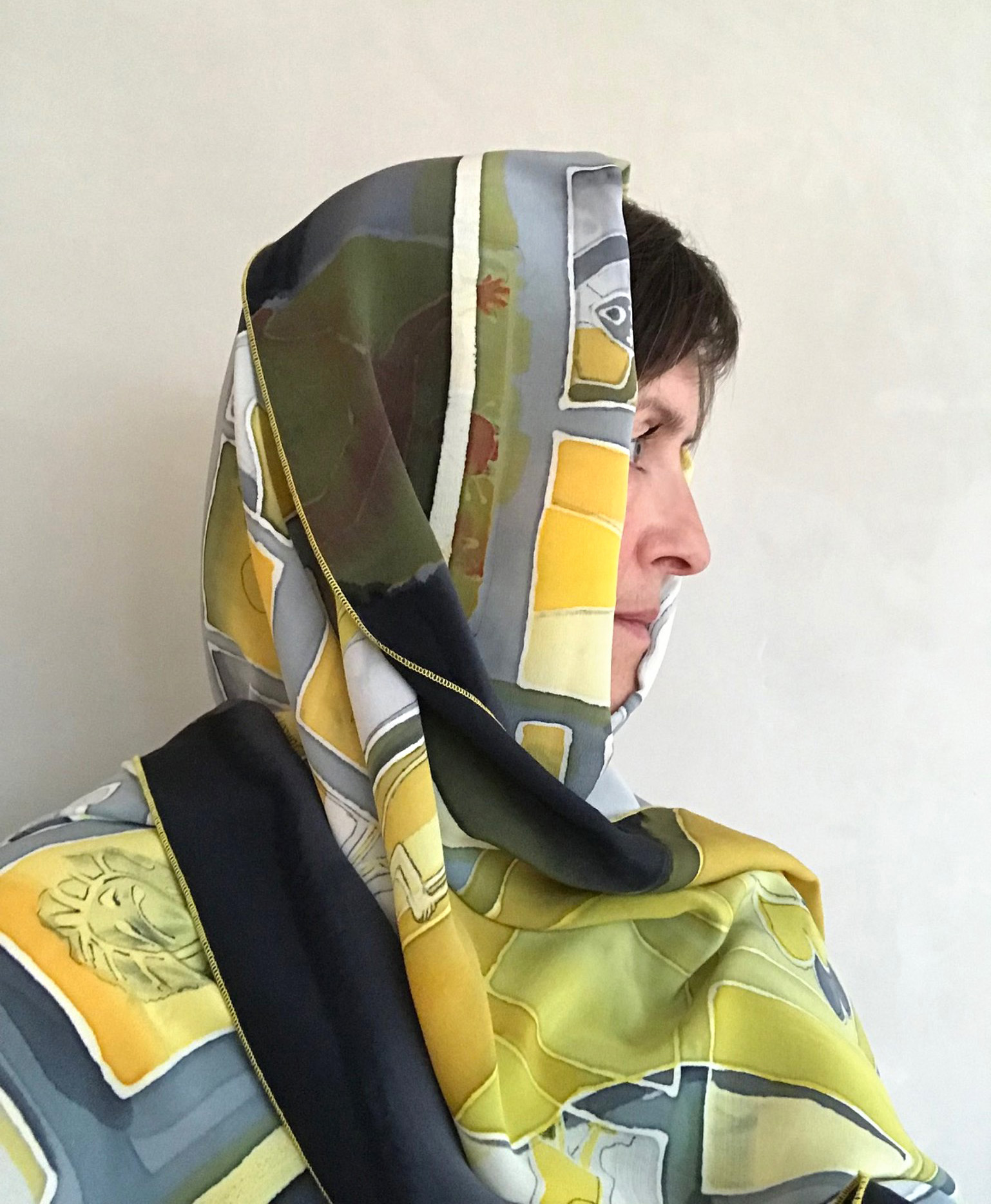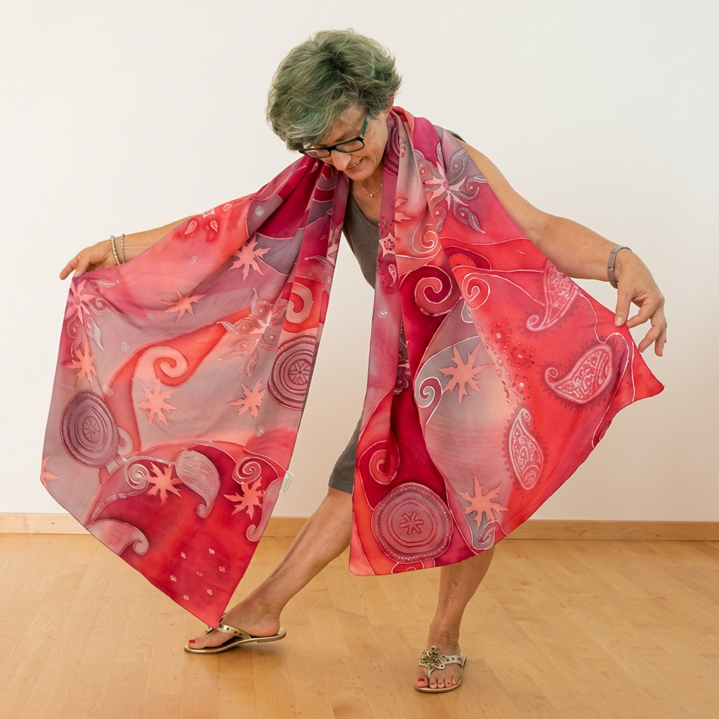 Each silk piece is a uniquely designed original, created in response to the wishes of the client. During a visit to your home or at the atelier, we explore together what your personal silk work wants to express — which colours, forms, and kind of presence your cloth should carry.Jedes Seidenwerk ist ein individuell gestaltetes Unikat, das nach den Wünschen der Kundin oder des Kunden entsteht. Bei einem Besuch bei dir zu Hause oder im Atelier besprechen und erspüren wir gemeinsam, was dein persönliches Seidenwerk zeigen möchte.